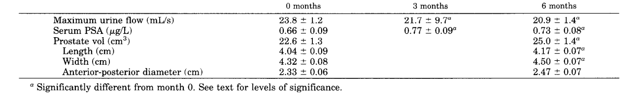 The maximum urine flow rate decreased with treatment over time (P = 0.0010; Table 5). Urine flow rates at baseline were higher than at 3 and 6 months. Serum PSA levels showed a small, but significant, increase with T replacement (P = 0.0039). Serum PSA levels at baseline were significantly lower than those at 3 and 6 months; however, the levels were not different between 3 and 6 months. Ultrasonography of the prostate gland showed small, but significant, increases in length (P = 0.0033), width (P = 0.0001), and volume (P = 0.0001). One of the 67 subjects complained of urgency and frequency at the 3 month visit after the onset of SLT treatment. At his pretreatment visit, his digital rectal examination showed a mildly enlarged prostate with no other abnormality. The maximum urine flow was 13.9 mL / s, serum PSA was 3.4 mg/ L, and ultrasonography showed an enlarged prostate measuring 5.4 X 5.6 X 3.7 cm consistent with benign prostate hypertrophy. At his 3 month visit, he complained of urgency and marked increased frequency. His maximum urine flow was 13.7 mL/s, and his PSA was 11.3 mg/L. T treatment was withdrawn, and he was referred to a urologist, who diagnosed prostatitis. After treatment with a course of antibiotics, his symptoms markedly improved, and serum PSA fell to 6.1 mg/L. Needle biopsy of the prostate showed benign prostatic hypertrophy. None of the other subjects had any symptoms or signs of prostate disease before or during SLT replacement.