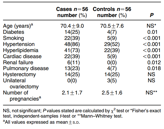 Selection of the control group Natural postmenopausal women with the same conditions as that for the selection of the case group, but without or with only mild (here defined as < 10%) stenotic atheromatous plaque of the extracranial carotid arteries were included in the control group. Women with a history of coronary artery disease, stroke, peripheral arterial disease or abnormal ankle/brachial index (ABI) were excluded. These control subjects were matched for age and were recruited from partners, family or friends of the members of the surgical staff, from partners of men undergoing CEA, from women undergoing varicose vein surgery or hernia repair and from patients of the one day geriatric centre. The study was approved by the local ethics committee and all subjects gave informed consent.