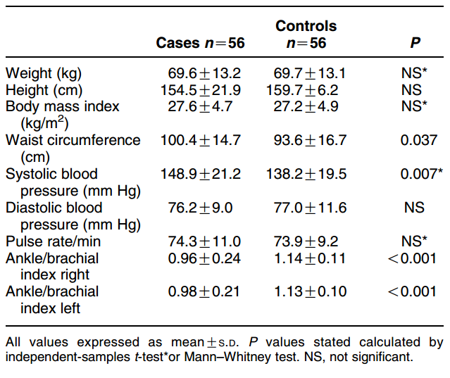 The relationship between baseline variables and particular parameters with the hormone levels was assessed by factorial ANOVA. The variables case/ control, hyperlipidemia, and ABI, which were significantly related with hormone levels, were selected for multivariate analysis using stepwise linear regression. Statistical significance was accepted when P < 0.05.