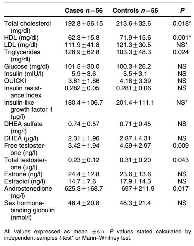 Sample collection and assay Early morning (between 0730 and 0830 h) fasting blood samples were taken from each control and case (the day before CEA). The serum levels of total cholesterol, high-density lipoprotein (HDL), triglycerides, and glucose were immediately assessed by means of enzymatic methods, low-density lipoprotein (LDL) was calculated according to the Friedewald formula (LDL = total cholesterol — HDL — triclycerides/5). Serum insulin was measured using a commercially available monoclonal IRMA (CIS bio, Gif-sur-Yvette, France). The insulin assay, calibrated against the MRC Insulin World Health Organization 66/304, had an analytical sensitivity of 0.25 mIU/l and within- and between-run coefficients of variation of < 4 and < 8% respectively. The assay had no cross-reaction with proinsulin (< 0.001%). The quantitative insulin sensitivity check index (QUICKI) was defined by the following formula: QUICKI = 1/(log (fasting insulin + log (fasting glucose)) as described by Katz et al. (18). The insulin resistance index (IRI) was calculated as 1/QUICKI. Serum insulin-like growth factor-I (IGF-I) was measured after acid-ethanol extraction using a commercially available RIA (DSL, Wester, TX, USA). The IGF-I assay had an analytical sensitivity of 0.8 mg/l and within- and between-run coefficients of variation of < 4 and < 10% respectively. Serum androstenedione, DHEA, estrone, and testosterone were measured after extraction with ethyl ether using a commercially available radioimmuno assay (Immunotech, France, BioSource, Belgium, Orion Diagnostica, Finland). The analytical sensitivity was 14 ng/l, 0.3 mg/l, 3.2 ng/l, and 0.1 nmol/l respectively; the intra-and inter-assay coefficients of variation were < 8 and < 12%, < 8 and < 12%, < 10 and < 15%, < 8 and < 15% respectively. Serum DHEA-S and estradiol were measured with the automated Elecsys immunoanalyser (Roche Diagnostics) with analytical sensitivity of 0.10 mg/dl and 5 ng/l, and intra-and inter-assay coefficients of variation were < 5 and < 10%, < 3and < 5% respectively. The cross-reaction of estrone is 0.515%. Serum SHBG was measured using an automated electrochemiluminescence assay (Roche Diagnostics), analytical sensitivity was 0.35 nmol/l and within- and between-run coefficients of variation were < 3 and < 4% respectively. Free testosterone values were calculated from total testosterone and SHBG using a fixed albumin concentration, according to Vermeulen et al. (19).
