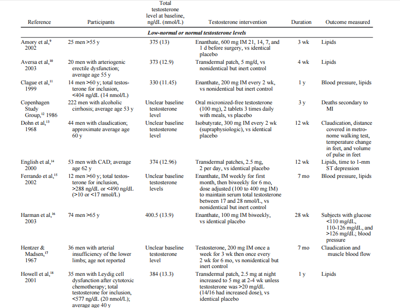 Eligible studies were fully published randomized trials of men with different degrees of androgen deficiency (includ-ing studies of men with normal or low-normal testosterone levels) who were allocated to receive either testosterone therapy alone (any available preparation) or placebo. Eli-gible studies measured major cardiovascular events, surro-gate cardiovascular end points, and cardiovascular risk factors. Major adverse cardiovascular events included cardiac death, myocardial infarction, and other vascular events such as stroke. Surrogate events included timing of exercise- induced electrocardiographic changes, subjective improvement in symptoms of claudication, ankle brachial index, walking distance, tests of muscle blood flow and plethysmography, hospitalization for chest pain, and need for revascularization. Cardiac risk factors included lipid fractions (total cholesterol, low-density lipoprotein cholesterol [LDL- C], high-density lipoprotein cholesterol [HDL-C], and triglycerides), blood pressure control, and glycemic control.