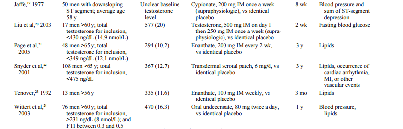 RESULTS: The 30 trials included 1642 men, 808 of whom were treated with testosterone. Overall, the trials had limited reporting of methodological features that prevent biased results (only 6 trials reported allocation concealment), enrolled few patients, and were of brief duration (only 4 trials followed up patients for >1 year). The median loss to follow-up across all 30 trials was 9%. Testosterone use in men with low testosterone levels led to inconsequential changes in blood pressure and glycemia and in all lipid fractions (total cholesterol: odds ratio [OR], -0.22; 95% confidence interval [CI], -0.71 to 0.27; high-density lipoprotein choles-terol: OR, -0.04; 95% CI, -0.39 to 0.30; low-density lipoprotein cholesterol: OR, 0.06; 95% CI, -0.30 to 0.42; and triglycerides: OR, -0.27; 95% CI, -0.61 to 0.08); results were similar in patients with low-normal to normal testosterone levels. The OR between testosterone use and any cardiovascular event pooled across trials that reported these events (n=6) was 1.82 (95% CI, 0.78 to 4.23). Several trials failed to report data on measured outcomes. For reasons we could not explain statistically, the results were inconsistent across trials.