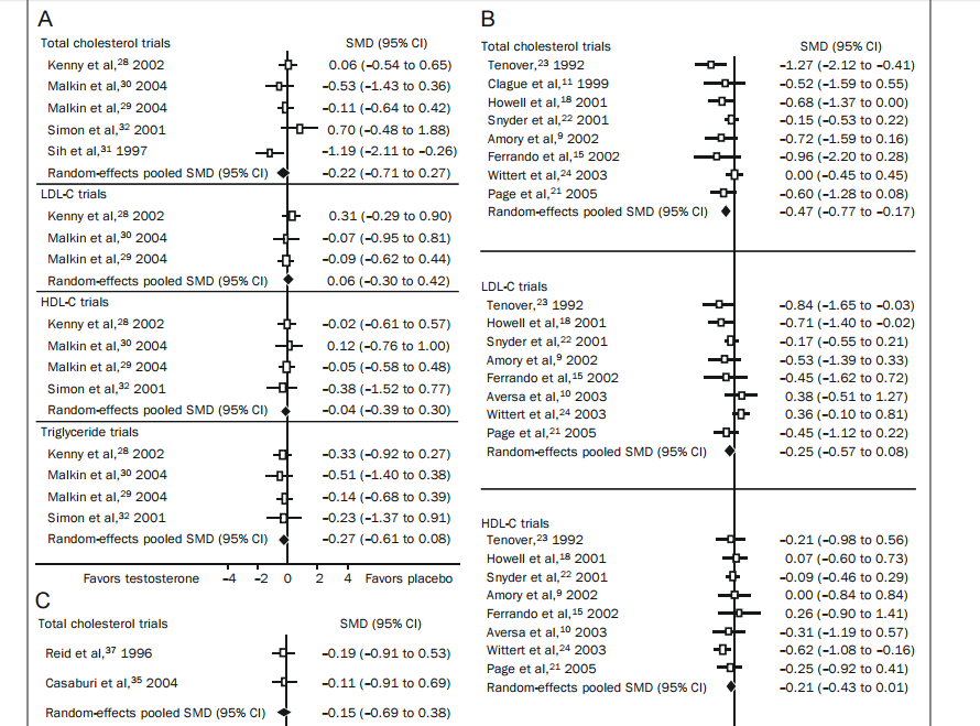 Our review results are consistent with the meta-analysis by Isidori et al42 despite some differences in study inclusion and search time frame (our study being limited to placebo- controlled trials and searching for 1 additional year). Also, our review includes a meta-analysis of cardiovascular events. A review by Calof et al43 limited its investigation to older men with low testosterone levels at baseline who received replacement doses of testosterone. This focus led to fewer included trials and no meta-analysis of lipid fractions but similar results about cardiovascular events.