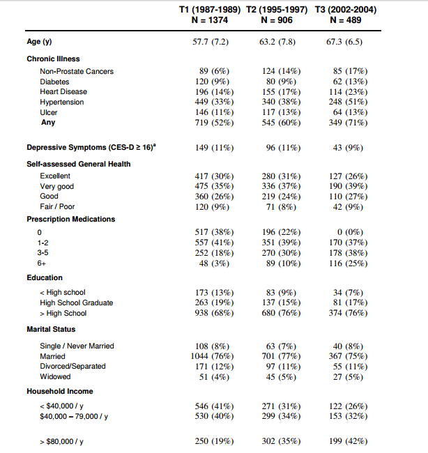 Demographic characteristics (age, education, income, marital status), health conditions (cancers, diabetes, heart disease, hypertension, and ulcer), self-assessed general health (a five-point ordinal scale), and smoking and daily alcohol consumption (23) were obtained via selfreport. Self-reported diagnoses of prostate cancer were supplemented with examination of available medical records. Height, weight and waist and hip circumference were obtained using methods developed for large-scale epidemiologic field work (24). Body mass index (BMI) and waist-to-hip ratio were derived by calculation. A comprehensive inventory of all prescription medications used by subjects was obtained. Daily caloric intake was measured using the Willett 1-year food frequency questionnaire (25). Physical activity and energy expenditure were derived from subjects’ seven-day recall of duration and frequency of their activities (26). Depressive symptoms were measured using the Centers for Epidemiological Studies - Depression (CES-D) scale (27).