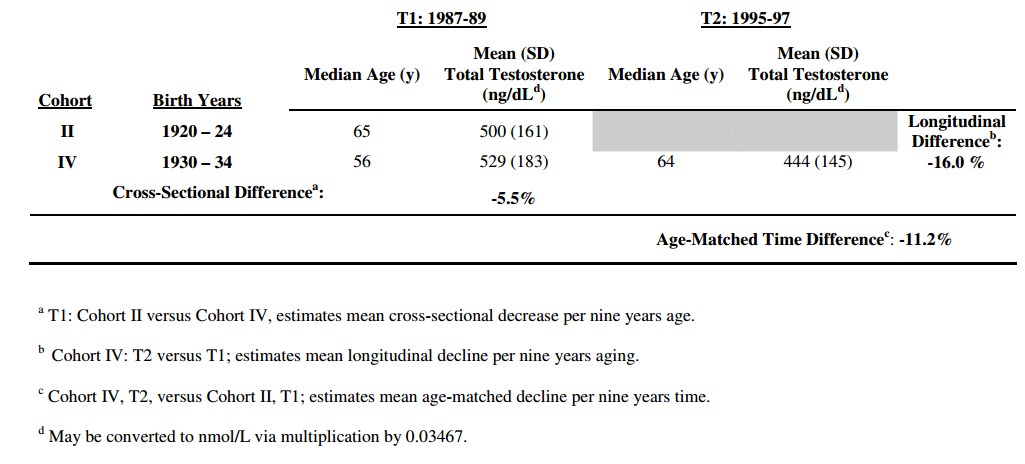 We therefore hypothesize that the observed age-matched decline in serum testosterone is due to some undocumented historical or contemporary influence, health-related or environmental, which manifests in observable age-matched differences in T concentrations separated either by time of observation or by birth cohort.
