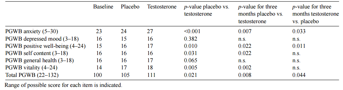 The total PGWB score as well as the subscales depicting “anxiety” and “positive well-being” demon-strated significant improvements both before and after cross over for the group receiving testosterone. For the subscales “self content” and “vitality” a significant difference was seen only for the first period starting from baseline. Forthe subscales concerning ‘depressed mood’ and ‘general health’ no differences between any of the two treatments or periods were found. (Table 2).