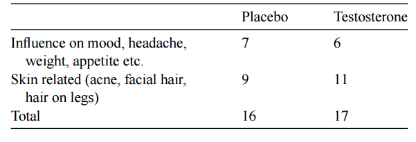 In a study of nine women with long-term use of androgen seven had a clitorial enlargement. Five women of these women had used testosterone injec-tions for more than five years and had testosterone levels of 6.6-14.9 nmol/l. A direct correlation between both duration of use as well as testosterone levels and clitoral size was found [19]. In the present study - in spite of high serum levels of testosterone - side effects during testosterone treatment were not different from placebo. Even so this risk must still be considered during longer treatments and regular monitoring of testosterone levels should be performed.