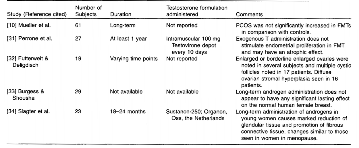 Fanchin R, Dubost G, Colau JC, Bremont-Weil C, Frydman R, Ayoubi JM, Grynberg M. Histology of genital tract and breast tissue after long-term testosterone administration in a female-to-male transsexual population. Reprod Biomed Online 2010;20:553-8.